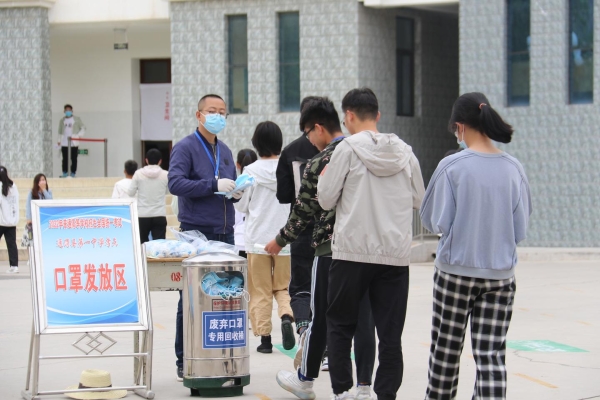 通渭县第一中学考点工作人员景毛毛说:“首先,考生在考点外按照考场的分组分四队,进校门以后,由工作人员统一配发专用的医用口罩,最后,考生按安检程序进入考场。”