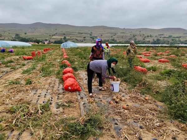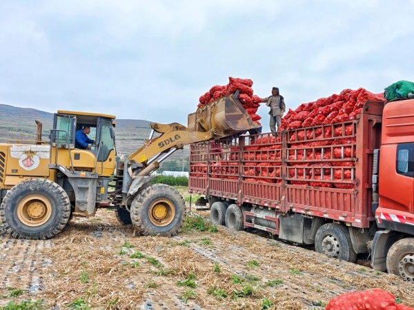 近日,通渭县义岗川镇文化村的露天蔬菜种植基地,200亩洋葱迎来丰收。在洋葱采收现场,村民将洋葱拔出、去叶、分装、搬运、装车,一排排袋子鼓鼓囊囊,紧实有序,整装待发,田间一派喜气洋洋“葱”满希望的丰收景象。