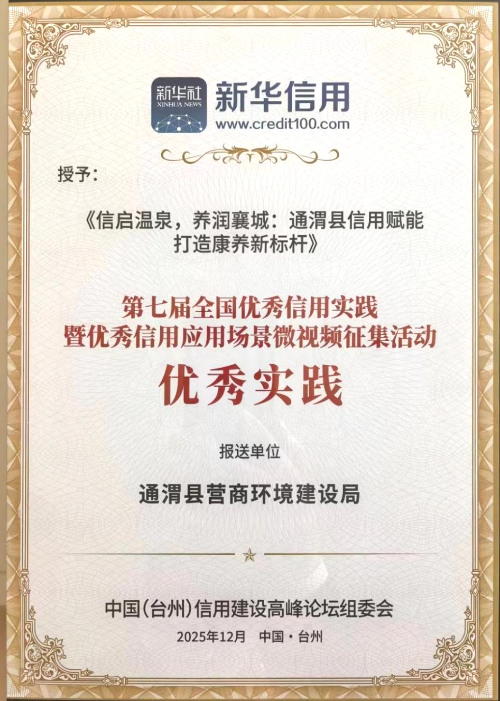 近日,第七届“新华信用杯”全国优秀信用实践暨优秀信用应用场景微视频征集活动评选结果揭晓。通渭县营商环境建设局报送的信用实践案例《信启温泉,养润襄城:通渭县信用赋能打造康养新标杆》从全国3000多个参评案例中脱颖而出,荣获全国信用应用场景优秀实践,成为全国192部、全省6部优秀实践案例之一。