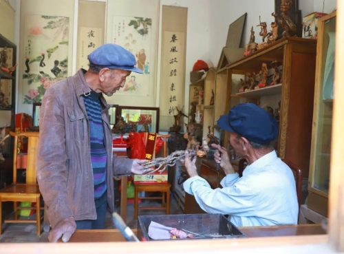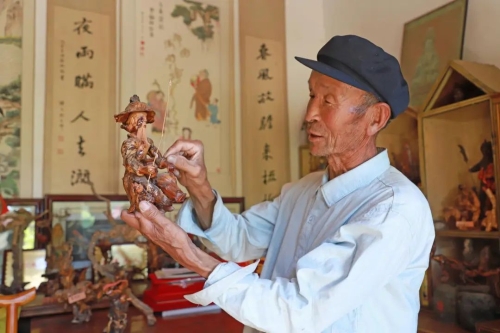 种树之余,两人的艺术人生同样绚烂。一个会画画,一个会做根雕。他们或伏身画案,挥毫泼墨,或是挥动刻刀,创作根雕,用笔墨和巧手描绘梦中的家园。