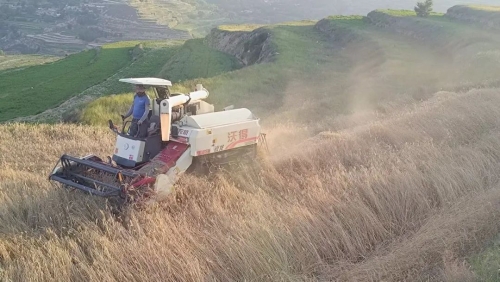 收割现场,收割机来回穿梭,吞吐间麦粒倾泻而出。为了这次收割,村民李大叔提前联系好了收割机,他指着自家10亩长势喜人的洋麦笑道,“尽管今年春季雨水较往年少了点,但也没影响到作物的生长,麦的长势特别好,收成不错。”