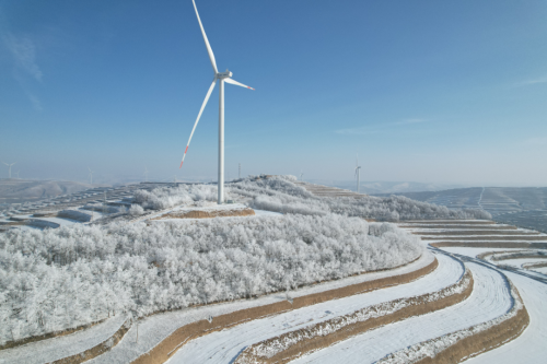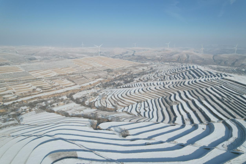 1月4日,冬阳微露。雪后的通渭县马营镇,千峰裹素,万木凝霜。往日错落的梯田,被白雪勾勒成银线蜿蜒;山巅风车静立,在澄澈天光下映着琼枝。
